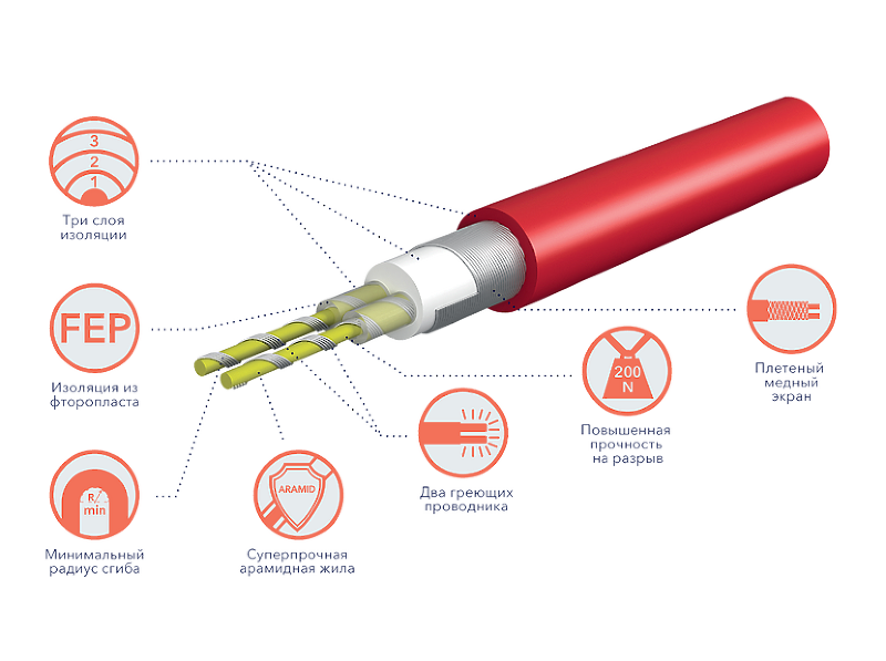 Конструкция позволяет перегибать кабель без риска обрыва или слома жил. Это достигается за счёт уникальной конструкции тонких витых греющих жил, длина которых превосходит длину кабеля на 6%. При любых деформациях или растяжениях основная нагрузка приходится на арамидную жилу, а греющие проводники легко адаптируются к изменению радиуса сгиба.